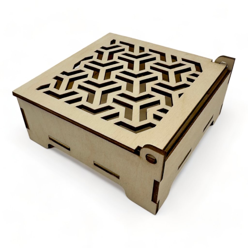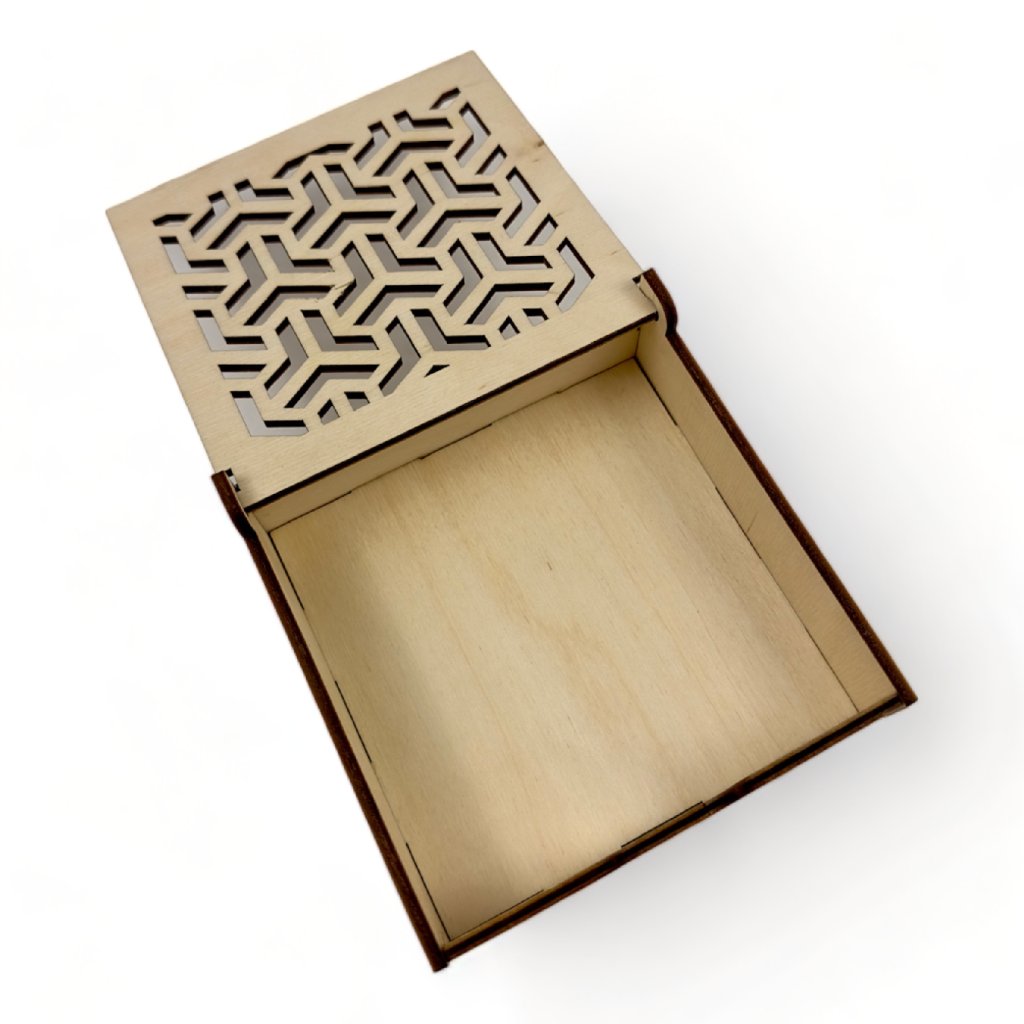Popis: Elegantní dřevěná šperkovnice s vyřezávaným víkem ve tvaru bludiště. Tento ručně vyráběný kousek nejen že slouží jako bezpečné úložiště pro vaše šperky, ale také jako dekorativní prvek pro váš domov. Šperkovnice je vyrobena z březové překližky a má hladký povrch, což z ní činí ideální dárek.